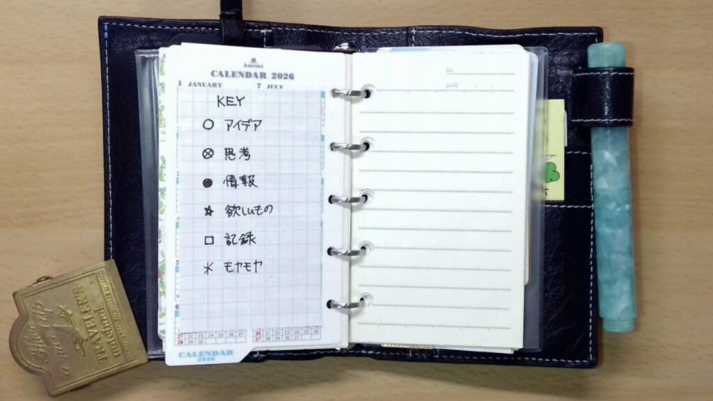 カレンダー下敷きリフィルにKEYのメモを貼り付けているのですが、外出先でちょっと思考を整理したいときとか、アイディアを後で見返せるように纏めるとき等に使っています。