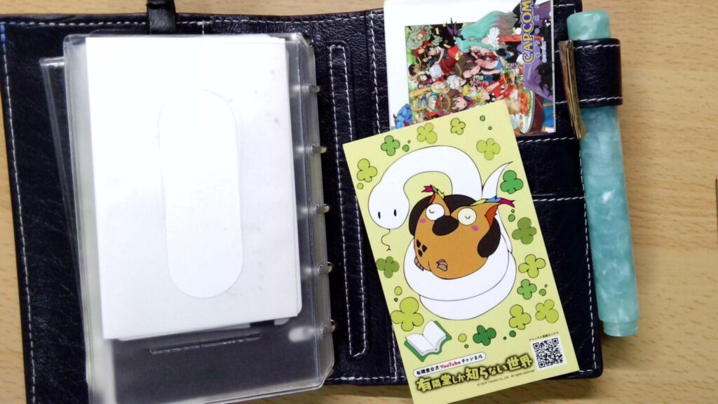 ちなみに、左側の名刺入れ部分には、支払いに使うクレジットカードや近所のスーパーのポイントカードを入れたり、貰ったレシート等を一時入れしていたりします。