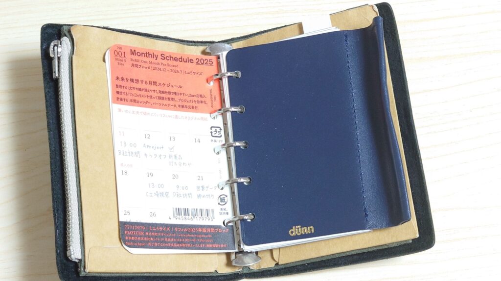 前の方には今年こそやるぞ! と買ったけどイマイチ使いこなせず空白が目立つ2025年マンスリーをそのままはさんでいます。あまりこれ持ち歩いていないのですが見た目としてはかなり太って可愛い感じになってますね。